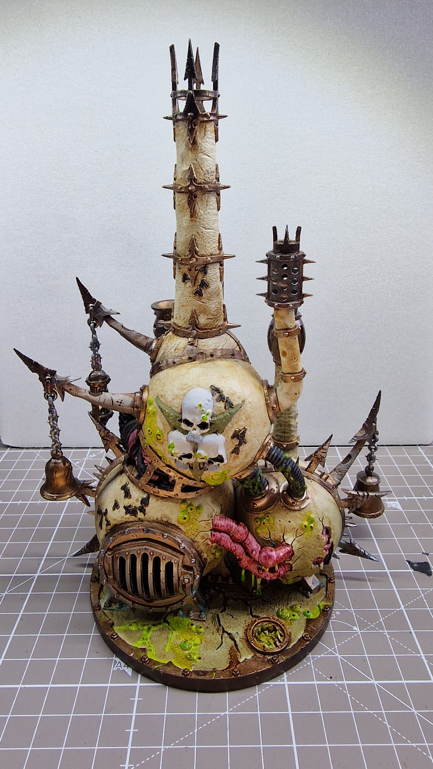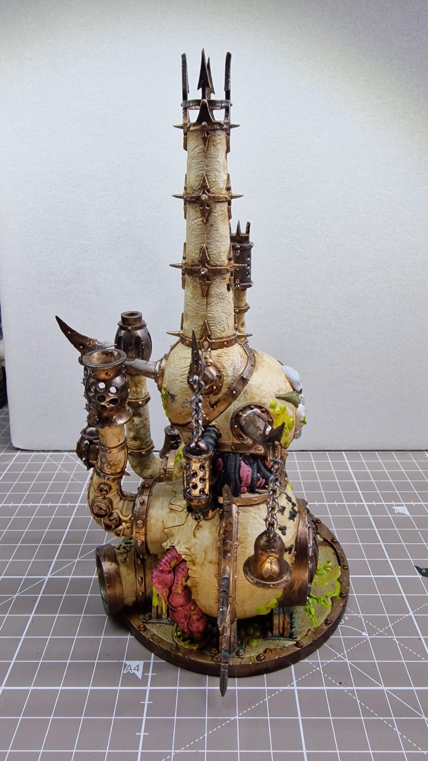 Festooned with swaying plague censers and tainted bells, Miasmic Malignifiers belch thick clouds of miasmal fumes from their rusted chimneys. Sown like spores across target worlds, they are parasites that suck filth from the ground and latch themselves on to local infrastructure, polluting the world on every level.